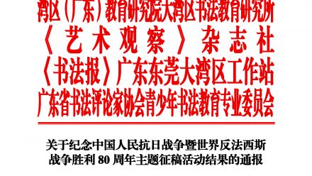 为铭记历史、缅怀先烈,弘扬伟大抗战精神,传承红色基因,激发广大艺术爱好者的爱国热情,香港诗书画艺术交流协会、《艺术观察》杂志社、大湾区书法教育研究所、《书法报》广东东莞大湾区工作站、广东省书法评论家协会青...